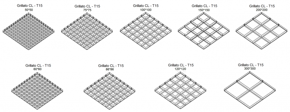 Grillato CL-T15 se deosebește de toate celelalte tipuri prin tehnologia de montare. Grilele separate 600x600 sunt aranjate pe sistemul de suspendare T-15 (sistem din oțel în formă de T cu o lățime de 15 mm). Lățimea părții vizibile a profilelor grillato CL-T15 la fel 15 mm.